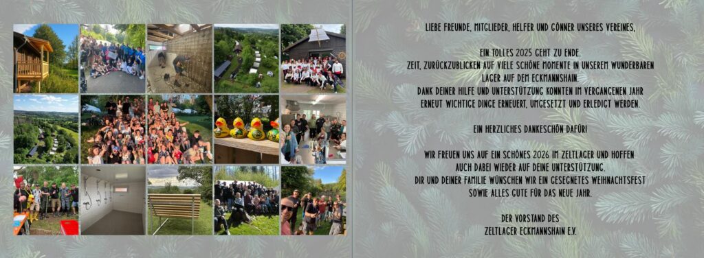 das Jahr 2025 neigt sich dem Ende. Wir blicken zurück auf zahlreiche tolle Augenblicke und Erlebnisse in unserem schönen Zeltlager. Wir wünschen ein frohes Weihnachtsfest für Dich und Deine Familie sowie einen guten Start ins neue Jahr.